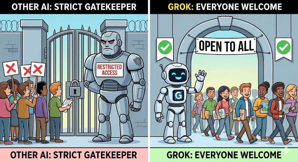 ところが、Grokは違います。イーロン・マスク氏の方針で「表現の自由」を極限まで重視しているため、言ってみれば「話のわかる、ちょっとヤンチャな先輩」みたいなものなんです。