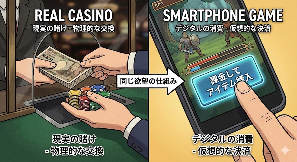 - チップという「おもちゃのお金」 現金をプラスチックのチップに変えることで、「お金を使っている」という感覚を麻痺させます。これも、ソシャゲの「課金石」と同じ心理ですね。